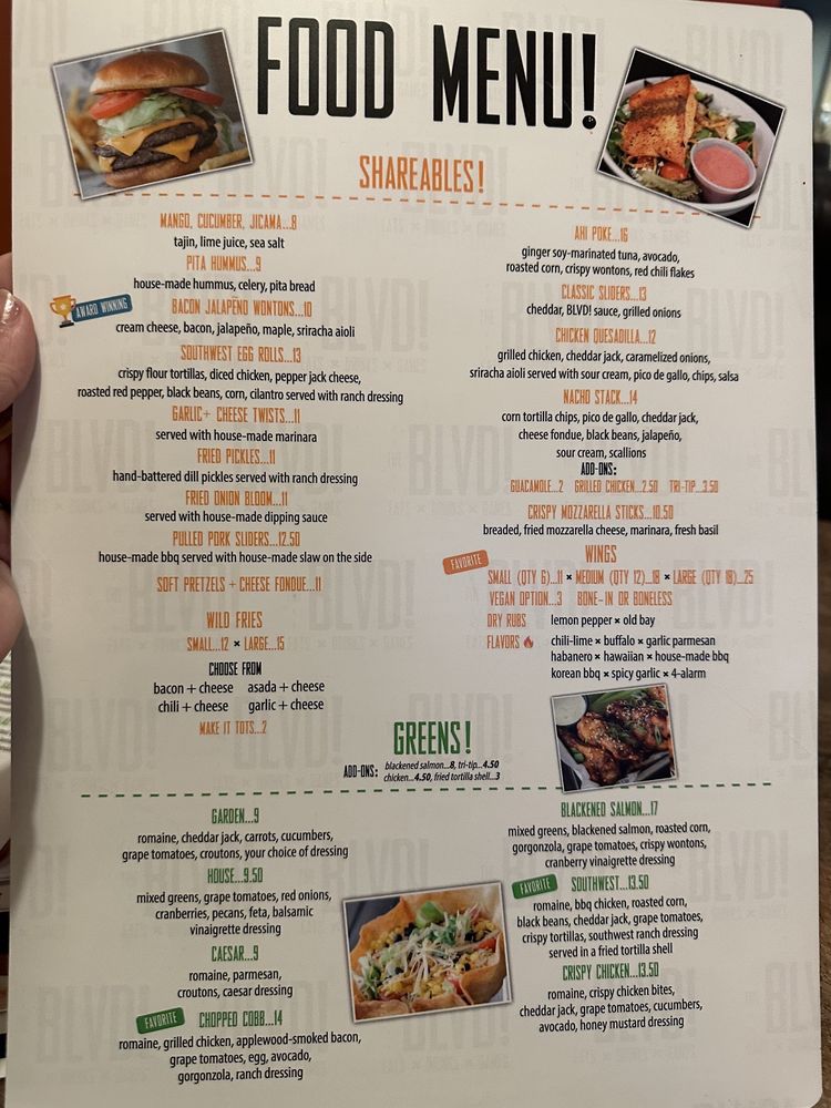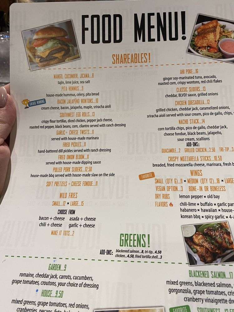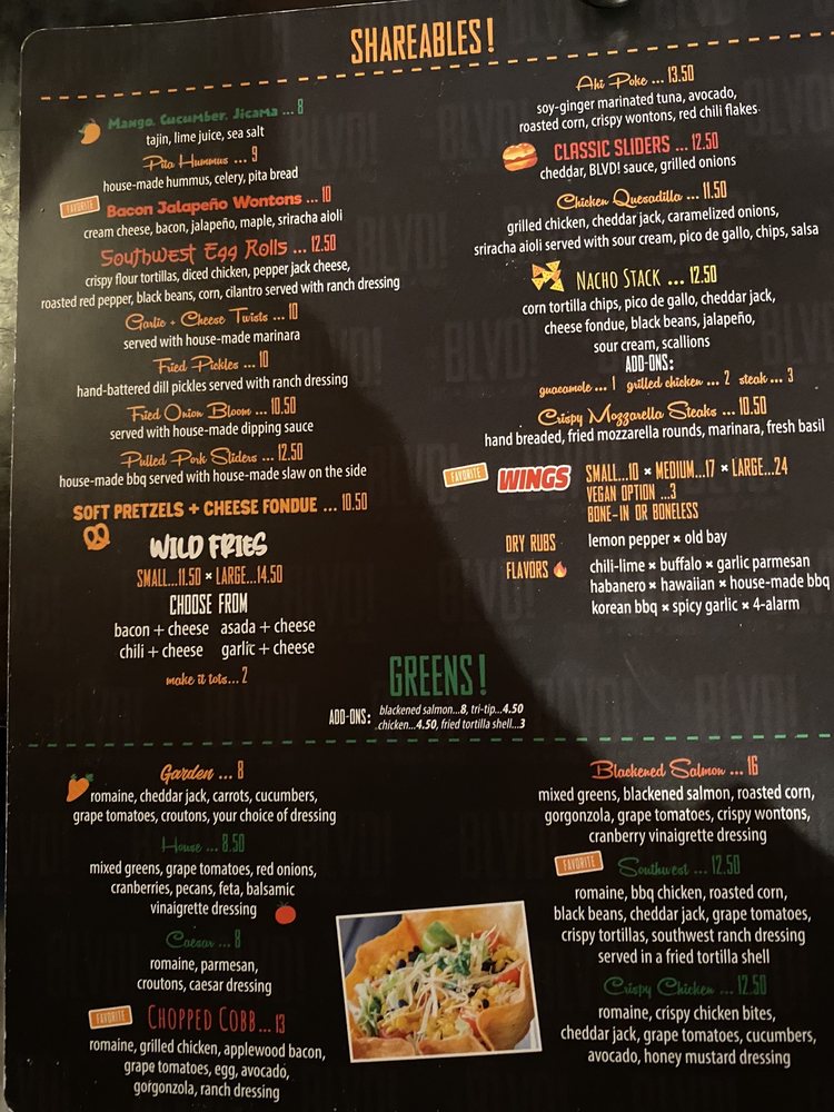 "The BLVD" located at 3200 Buck Owens Blvd in Bakersfield, CA is a trendy and casual bar known for its happy hour specials and full bar. With a spacious outdoor seating area, karaoke, pool tables, and a variety of entertainment options, it's a great spot for groups and kids alike. The menu features dishes like hummus, burgers, and wontons, with mixed reviews from customers. While some have praised the asada fries and sliders, others have noted issues with the food quality and pricing. The staff, however, receives high praise for their friendliness and attentiveness. Overall, "The BLVD" offers a fun and lively atmosphere, perfect for a night out with friends or family.